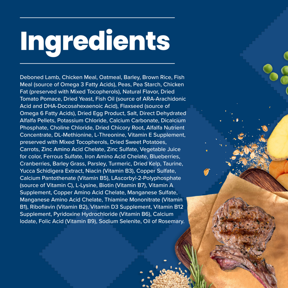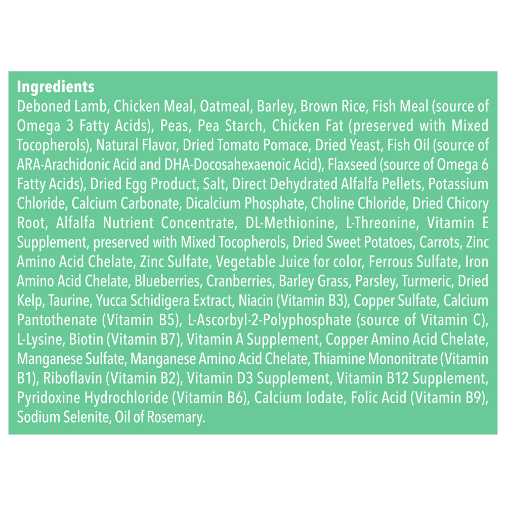 Deboned Lamb, Menhaden Fish Meal (source of Omega 3 Fatty Acids),Oatmeal,Brown Rice,Barley,Pea Starch,Lamb Meal,Pea Protein,Dried Egg Product,Peas,Natural Flavor,Chicken Fat (preserved with Mixed Tocopherols),Flaxseed (source of Omega 6 Fatty Acids),Dried Tomato Pomace,Fish Oil (source of ARA-Arachidonic Acid and DHA-Docosahexaenoic Acid),Dehydrated Alfalfa Meal,Salt,Choline Chloride,Potatoes,Dried Chicory Root, Pea Fiber,Alfalfa Nutrient Concentrate,Potassium Chloride,Calcium Carbonate,L-Threonine,preserved with Mixed Tocopherols,Sweet Potatoes,Carrots,DL-Methionine,Garlic,Zinc Amino Acid Chelate,Zinc Sulfate,Vegetable Juice for color,Ferrous Sulfate,Vitamin E Supplement,Iron Amino Acid Chelate,Blueberries,Cranberries,Barley Grass,Parsley,Yucca Schidigera Extract,Dried Kelp,Turmeric,Niacin (Vitamin B3),Calcium Pantothenate (Vitamin B5),L-Ascorbyl-2-Polyphosphate (source of Vitamin C),L-Carnitine,L-Lysine,Copper Sulfate,Biotin (Vitamin B7),Vitamin A Supplement,Copper Amino Acid Chelate,Manganese Sulfate,Taurine,Manganese Amino Acid Chelate,Thiamine Mononitrate (Vitamin B1),Riboflavin (Vitamin B2),Vitamin D3 Supplement,Vitamin B12 Supplement,Pyridoxine Hydrochloride (Vitamin B6),Calcium Iodate,Dried Yeast,Dried Enterococcus faecium fermentation product,Dried Lactobacillus acidophilus fermentation product,Dried Aspergillus niger fermentation extract,Dried Trichoderma longibrachiatum fermentation extract,Dried Bacillus subtilis fermentation extract,Folic Acid (Vitamin B9),Sodium Selenite,Oil of RosemaryGuaranteed Analysis