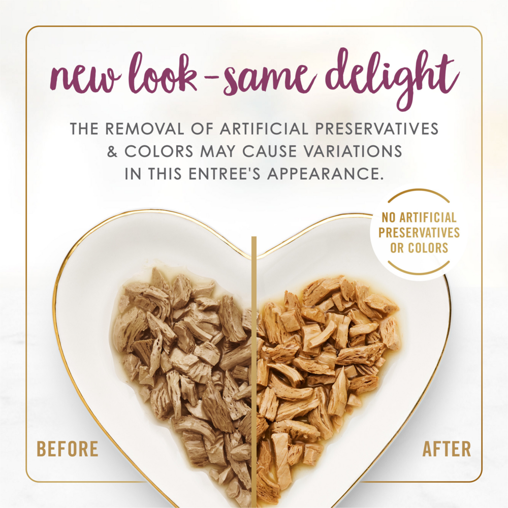Chicken Broth, Chicken, Liver, Wheat Gluten, Meat By-Products, Corn Starch-Modified, Natural and Artificial Flavors, Tricalcium Phosphate, Salt, Soy Protein Concentrate, Titanium Dioxide, Potassium Chloride, Taurine, Choline Chloride, Vitamin Supplements (E, A, D3, B12), Thiamin Mononitrate (Vitamin B1), Ferrous Sulfate, Zinc Sulfate, Manganese Sulfate, Pyridoxine Hydrochloride (Vitamin B6), Niacin, Calcium Pantothenate, Riboflavin Supplement (Vitamin B2), Copper Sulfate, Dicalcium Phosphate, Menadione Sodium Bisulfate Complex (Source of Vitamin K Activity) Folic Acid, Cobalt Carbonate, Potassium Iodide, Biotin.