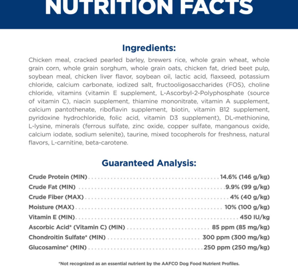 Chicken Meal, Cracked Pearled Barley, Brewers Rice, Whole Grain Wheat, Whole Grain Corn, Whole Grain Sorghum, Whole Grain Oats, Chicken Fat, Dried Beet Pulp, Soybean Meal, Chicken Liver Flavor, Soybean Oil, Lactic Acid, Flaxseed, Potassium Chloride, Calcium Carbonate, Iodized Salt, Choline Chloride, vitamins (Vitamin E Supplement, L-Ascorbyl-2-Polyphosphate (source of Vitamin C), Niacin Supplement, Thiamine Mononitrate, Vitamin A Supplement, Calcium Pantothenate, Riboflavin Supplement, Biotin, Vitamin B12 Supplement, Pyridoxine Hydrochloride, Folic Acid, Vitamin D3 Supplement), L-Lysine, minerals (Ferrous Sulfate, Zinc Oxide, Copper Sulfate, Manganous Oxide, Calcium Iodate, Sodium Selenite), Taurine, DL-Methionine, Oat Fiber, Mixed Tocopherols for freshness, Natural Flavors, L-Carnitine, Beta-Carotene, Apples, Broccoli, Carrots, Cranberries, Green Peas.