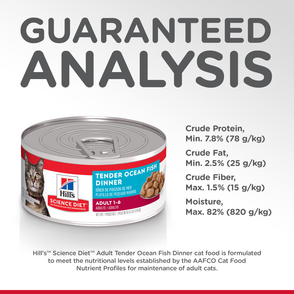 Give your grown cat a delicious feast with the balanced nutrition they need. Hill's Science Diet Adult Tender Ocean Fish Dinner is the perfect balance of tender, real ocean fish chunks, and the key nutrients adult cats need. With quality protein for lean muscle, this adult cat food made with natural ingredients can support your kitty's health during his or her prime years. There’s more to love with the new look of Science Diet® Some of our products also have new names, new kibble shapes & new formulas. • High-quality protein to help your adult cat maintain lean muscle • Made with purposeful, easily digestible ingredients grown cats enjoy • Succulent wet food made with natural ingredients • Try all three flavors to give your furry feline the variety they crave • #1 Veterinarian Recommended Delectable chunks with tender ocean fish smothered in a rich gravy.