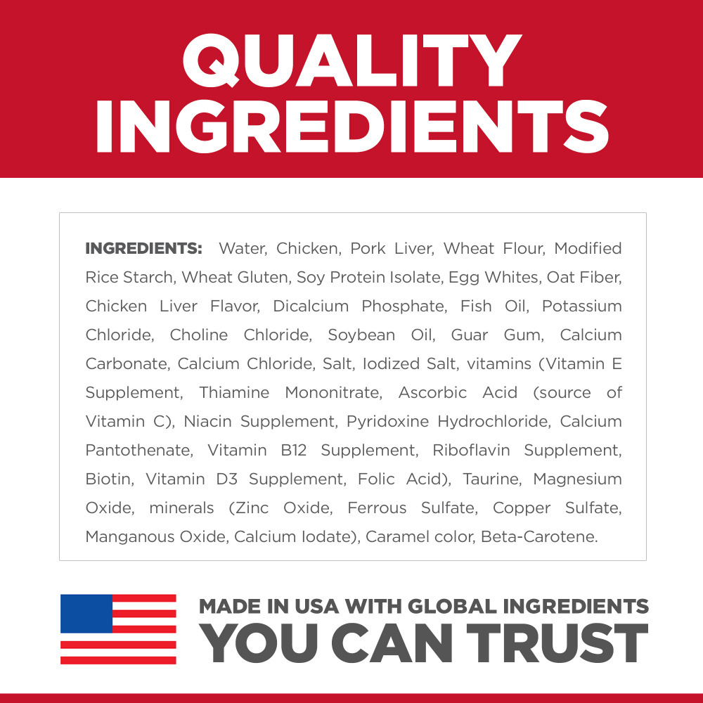 Now you can feed delicious Hill’s Science Diet stews in recipes with no corn, wheat or soy. Tasty and nutritious, this canned cat food is made in the USA with global ingredients you can trust, including chicken and vegetables combined in a mouthwatering sauce. It uses high-quality protein for lean muscles, and has clinically proven antioxidants vitamins C+E for a healthy immune system. Hill’s Science Diet No Corn, Wheat, Soy stews are made with natural ingredients, plus added vitamins, minerals, and amino acids, and formulated with ingredients to support heart health. Try them as a complete meal, or on top of Science Diet dry cat food. • Biology-based nutrition of Science Diet with no corn, wheat or soy Delicious stew can be fed by itself or paired with Science Diet dry food High-quality protein for lean muscles • Supports ideal body weight for adult cats • Canned cat food made with natural ingredients • Formulated with ingredients to support heart health From • Hill’s, the #1 Veterinarian Recommended pet food brand