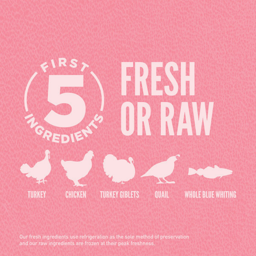 Turkey, chicken, turkey giblets (liver, heart, gizzard), whole herring, salmon, dehydrated turkey, dehydrated chicken, dehydrated sardine, dehydrated chicken liver, dehydrated egg, whole red lentils, whole pinto beans, whole navy beans, chicken fat, whole green lentils, whole chickpeas, dried apple pomace, whole peas, chicken liver, eggs, natural chicken flavor, pollock oil, chicken heart, New Zealand green mussels, vitamin E supplement, whole cranberries, whole pumpkin, whole butternut squash, collard greens, whole apples, whole pears, dried kelp, zinc proteinate, mixed tocopherols (preservative), salt, niacin, thiamine mononitrate, calcium pantothenate, pyridoxine hydrochloride, riboflavin, folic acid, vitamin B12 supplement, copper proteinate, dried Bacillus coagulans fermentation product, dried chicory root, turmeric, sarsaparilla root, althea root, rosehips, juniper berries, citric acid (preservative), rosemary extract.