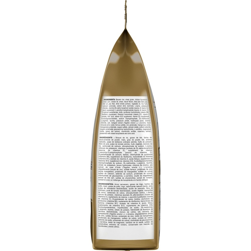 Brewers rice, wheat gluten, chicken by-product meal, corn, chicken fat, wheat, natural flavors, dried plain beet pulp, fish oil, pea fiber, dried tomato pomace, vegetable oil, rice hulls, calcium carbonate, sodium silico aluminate, L-lysine, potassium chloride, vitamins [DL-alpha tocopherol acetate (source of vitamin E), niacin supplement, L-ascorbyl-2-polyphosphate (source of vitamin C), D-calcium pantothenate, biotin, pyridoxine hydrochloride (vitamin B6), riboflavin supplement, thiamine mononitrate (vitamin B1), vitamin A acetate, folic acid, vitamin B12 supplement, vitamin D3 supplement], fructooligosaccharides, sodium tripolyphosphate, DL-methionine, L-arginine, taurine, potassium citrate, hydrolyzed yeast, choline chloride, salt, marigold extract (Tagetes erecta L.), L-tyrosine, trace minerals [zinc oxide, ferrous sulfate, zinc proteinate, manganous oxide, manganese proteinate, copper sulfate, calcium iodate, sodium selenite, copper proteinate], glucosamine hydrochloride, L-carnitine, magnesium oxide, green tea extract, chondroitin sulfate, rosemary extract, preserved with mixed tocopherols and citric acid.