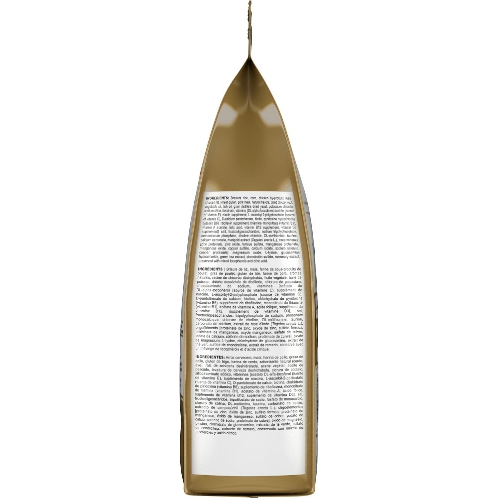 Brewers rice, corn, chicken by-product meal, chicken fat, wheat gluten, pork meal, natural flavors, dried chicory root, vegetable oil, fish oil, grain distillers dried yeast, potassium chloride, sodium silico aluminate, vitamins [DL-alpha tocopherol acetate (source of vitamin E), niacin supplement, L-ascorbyl-2-polyphosphate (source of vitamin C), D-calcium pantothenate, biotin, pyridoxine hydrochloride (vitamin B6), riboflavin supplement, thiamine mononitrate (vitamin B1), vitamin A acetate, folic acid, vitamin B12 supplement, vitamin D3 supplement], salt, fructooligosaccharides, sodium tripolyphosphate, monocalcium phosphate, choline chloride, DL-methionine, taurine, calcium carbonate, marigold extract (Tagetes erecta L.), trace minerals [zinc proteinate, zinc oxide, ferrous sulfate, manganese proteinate, manganous oxide, copper sulfate, calcium iodate, sodium selenite, copper proteinate], magnesium oxide, L-lysine, glucosamine hydrochloride, green tea extract, chondroitin sulfate, rosemary extract, preserved with mixed tocopherols and citric acid.