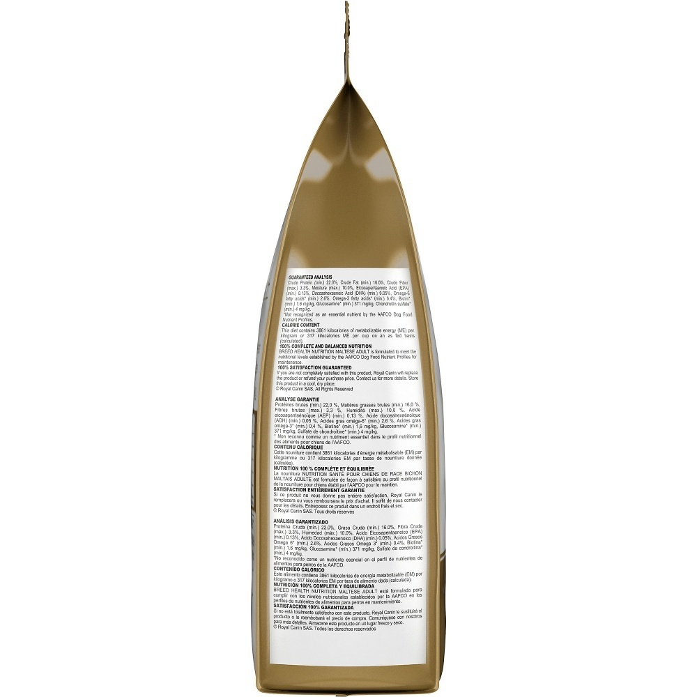 Royal Canin knows what makes your Maltese magnificent is in the details. This original lap dog is one of the oldest types of the toy breeds, known for their devoted companionship and beautiful white, silky coats. They can benefit from the right diet to maintain skin and coat health, aid with digestion, and satisfy their finicky appetites. Royal Canin Maltese Adult dry dog food is tailor-made nutrition created just for your purebred Maltese. This exclusive breed-specific diet is uniquely formulated for your Maltese, with the specific nutrients to help them thrive. The custom kibble is specially designed for your Maltese’s medium-length tapered muzzle and scissor bite, making it easy for them to pick up and chew. Biotin, omega-3, and omega-6 fatty acids, including EPA and DHA from fish oil, give your Maltese’s silky, long coat a beautiful shine. Highly digestible proteins and precise fiber content support healthy digestion to help reduce stools and unpleasant stool odors. And to please your picky eater, the combination of kibble size, exceptional aromas, and flavors will keep them happily satisfied. With nearly 50 years of scientific research and observation, Royal Canin continues to deliver targeted nutrition to feed every pet’s magnificence. Not satisfied? Then neither are we. Our breed health formulas are 100% satisfaction guaranteed. (Just contact us for more details. Royal Canin Maltese Adult dry dog food is designed to meet the nutritional needs of a purebred Maltese 10 months and older Exclusive kibble design helps Maltese easily pick up and chew their food Supports coat health with biotin and omega-3 and -6 fatty acids to help maintain silky, long hair Helps reduce stool amount and stool odor with highly digestible proteins and precise fiber content High palatability with exceptional aromas and flavors to satisfy fussy eaters