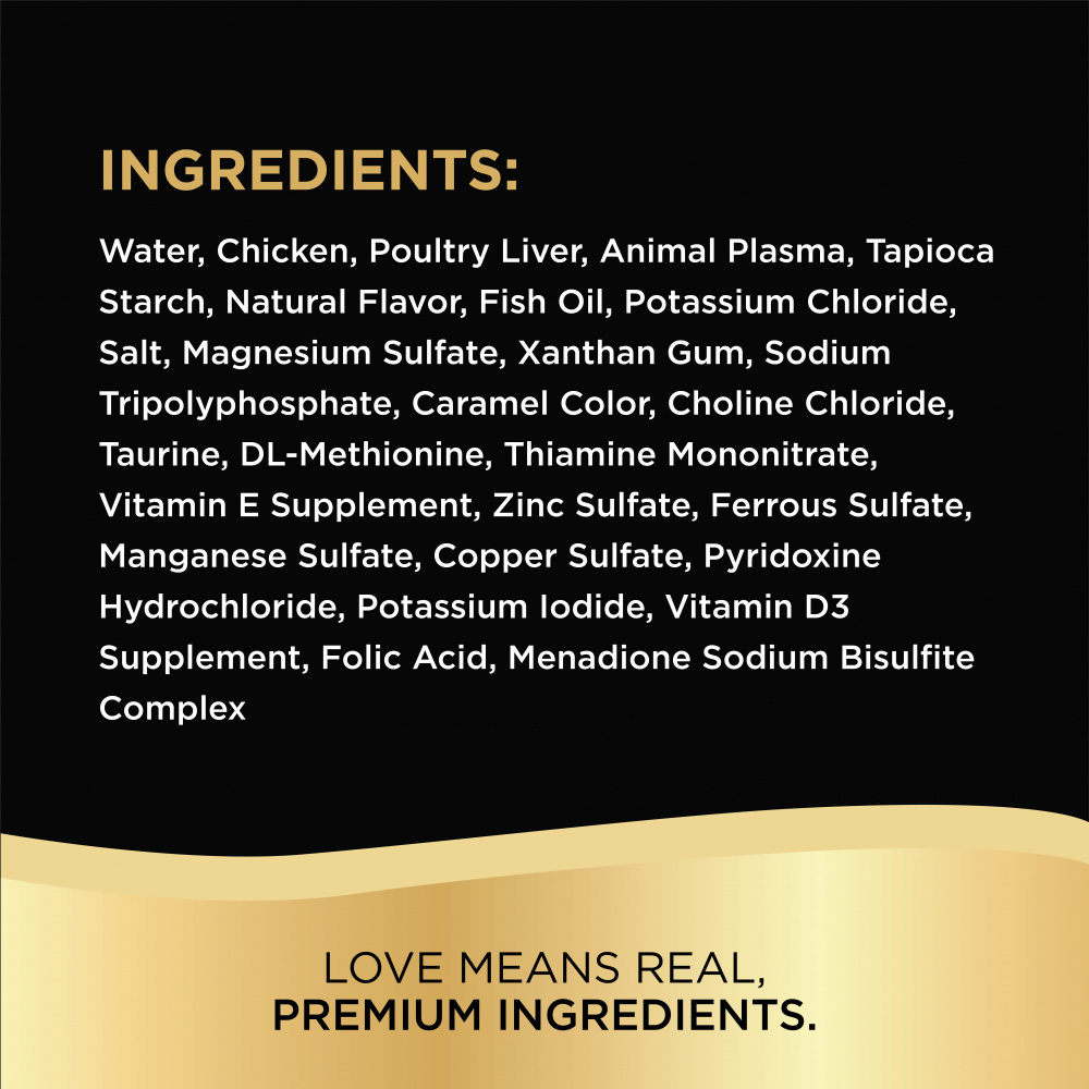 Chicken Broth, Chicken, Chicken Liver, Poultry By-Products, Meat By-Products, Tapioca Starch, Natural Flavor, Minerals (Potassium Chloride, Magnesium Sulfate, Zinc Sulfate, Iron Sulfate, Manganese Sulfate, Potassium Iodide, Copper Sulfate), Sodium Tripolyphosphate, Added Color, Fish Oil (Preserved with Mixed Tocopherols), Salt, Xanthan Gum, Vitamins (Choline Chloride, Thiamine Mononitrate [Vitamin B1], Vitamin E Supplement, Pyridoxine Hydrochloride [Vitamin B6], Vitamin D3 Supplement, Folic Acid, Menadione Sodium Bisulfite Complex [Source of Vitamin K Activity]), Taurine, DL-Methionine