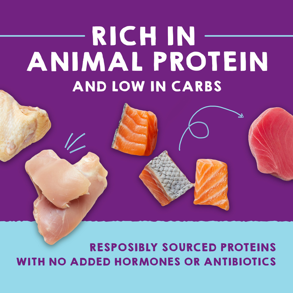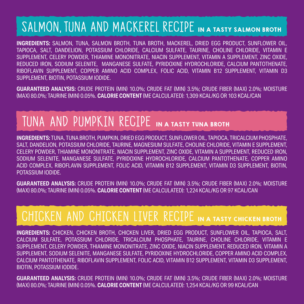 Chicken & Chicken Liver: Chicken, chicken broth, chicken liver, dried egg product, sunflower oil, tapioca, salt, calcium sulfate, potassium chloride, tricalcium phosphate, taurine, choline chloride, vitamin E supplement, celery powder, thiamine mononitrate, zinc oxide, niacin supplement, reduced iron, vitamin A supplement, sodium selenite, manganese sulfate, pyridoxine hydrochloride, copper amino acid complex, calcium pantothenate, riboflavin supplement, folic acid, vitamin B12 supplement, vitamin D3 supplement, biotin, potassium iodide.Chicken & Salmon: Chicken, chicken broth, salmon, dried egg product, sunflower oil, tapioca, salt, dandelion, calcium sulfate, potassium chloride, tricalcium phosphate, taurine, choline chloride, vitamin E supplement, celery powder, thiamine mononitrate, zinc oxide, reduced iron, niacin supplement, vitamin A supplement, sodium selenite, manganese sulfate, copper amino acid complex, pyridoxine hydrochloride, calcium pantothenate, riboflavin supplement, folic acid, vitamin B12 supplement, vitamin D3 supplement, potassium iodide, biotin.Chicken & Tuna: Chicken, chicken broth, tuna, dried egg product, sunflower oil, tapioca, salt, calcium sulfate, dandelion, potassium chloride, tricalcium phosphate, taurine, choline chloride, vitamin E supplement, celery powder, thiamine mononitrate, zinc oxide, niacin supplement, reduced iron, vitamin A supplement, sodium selenite, manganese sulfate, pyridoxine hydrochloride, copper amino acid complex, calcium pantothenate, riboflavin supplement, folic acid, vitamin B12 supplement, vitamin D3 supplement, biotin, potassium iodide.Duck & Chicken: Duck, chicken, duck broth, chicken broth, dried egg product, sunflower oil, tapioca, salt, calcium sulfate, tricalcium phosphate, potassium chloride, taurine, choline chloride, vitamin E supplement, celery powder, thiamine mononitrate, niacin supplement, vitamin A supplement, zinc oxide, reduced iron, sodium selenite, pyridoxine hydrochloride, manganese sulfate, calcium pantothenate, riboflavin supplement, copper amino acid complex, folic acid, vitamin B12 supplement, vitamin D3 supplement, biotin, potassium iodide.Salmon, Tuna & Mackerel: Salmon, tuna, salmon broth, tuna broth, mackerel, dried egg product, sunflower oil, tapioca, salt, dandelion, potassium chloride, calcium sulfate, taurine, choline chloride, vitamin E supplement, celery powder, thiamine mononitrate, niacin supplement, vitamin A supplement, zinc oxide, reduced iron, sodium selenite, manganese sulfate, pyridoxine hydrochloride, calcium pantothenate, riboflavin supplement, copper amino acid complex, folic acid, vitamin B12 supplement, vitamin D3 supplement, biotin, potassium iodide.Tuna & Pumpkin: Tuna, tuna broth, pumpkin, dried egg product, sunflower oil, tapioca, tricalcium phosphate, salt, dandelion, potassium chloride, taurine, magnesium sulfate, choline chloride, vitamin E supplement, celery powder, thiamine mononitrate, niacin supplement, zinc oxide, vitamin A supplement, reduced iron, sodium selenite, manganese sulfate, pyridoxine hydrochloride, calcium pantothenate, copper amino acid complex, riboflavin supplement, folic acid, vitamin B12 supplement, vitamin D3 supplement, biotin, potassium iodide.