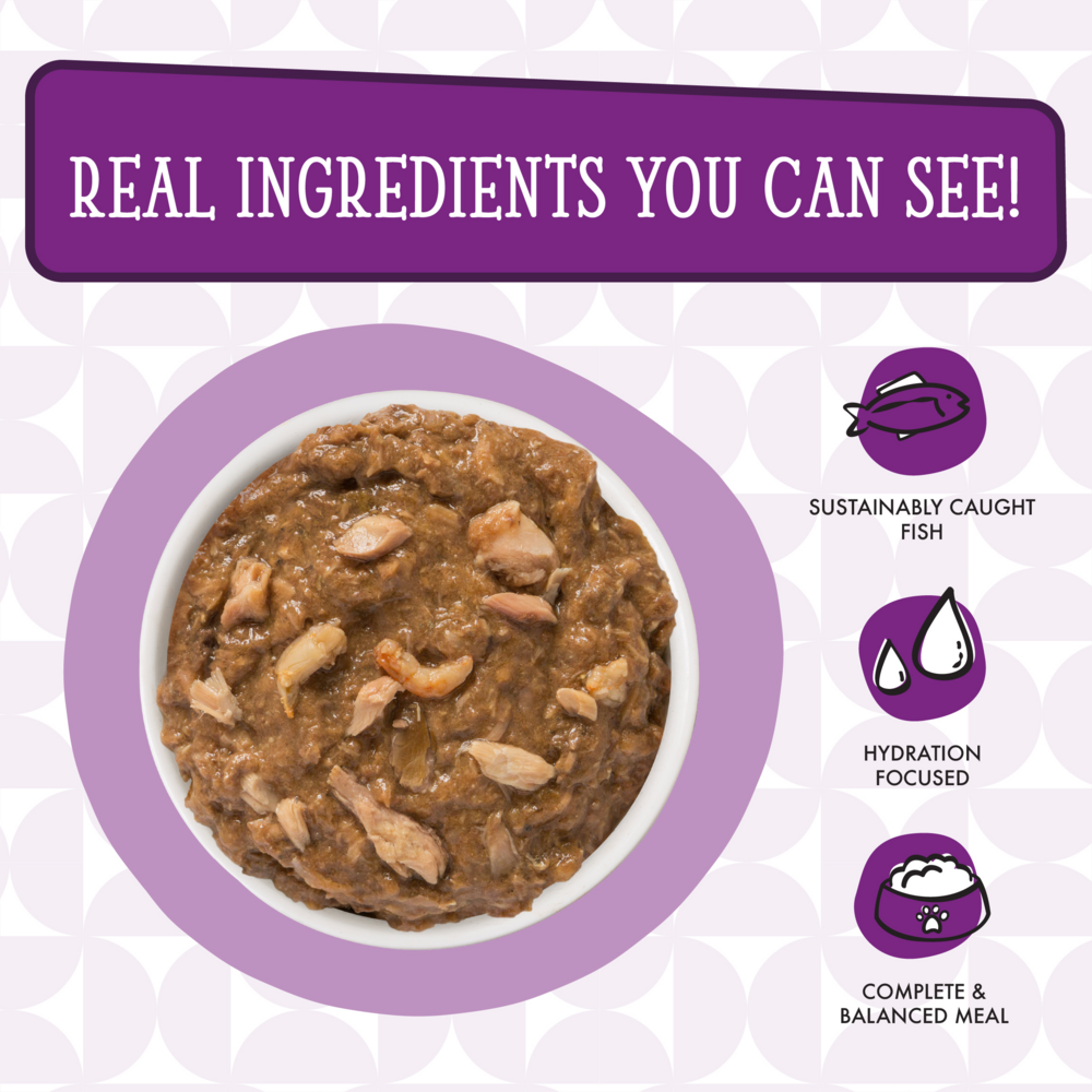 Fish Broth, Mackerel, Tuna, Shrimp, Locust Bean Gum, Sunflower Seed Oil, Calcium Lactate, Guar Gum, Fish Oil, Tricalcium Phosphate, Xanthan Gum, Potassium Chloride, Choline Chloride, Taurine, Vitamin E Supplement, Zinc Sulfate, Nicotinic Acid (Vitamin B3), Thiamine Mononitrate (Vitamin B1), Calcium Pantothenate, Vitamin A Supplement, Manganese Sulfate, Ferrous Sulfate, Canthaxanthin, Riboflavin Supplement (Vitamin B2), Pyridoxine Hydrochloride (Vitamin B6), Vitamin D3 Supplement, Copper Sulfate, Folic Acid, Potassium Iodide, Menadione Sodium Bisulfite (Source of Vitamin K), Biotin, Vitamin B12 SupplementGuaranteed Analysis