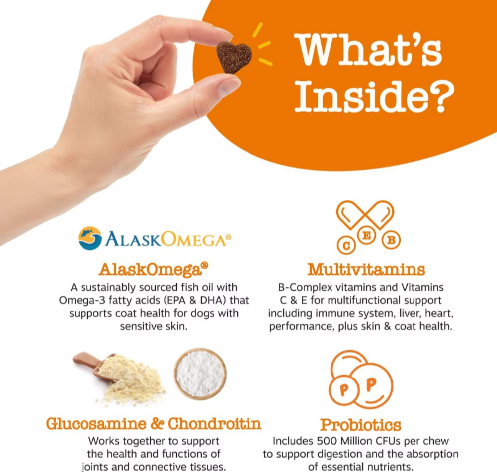 8-in-1 BitesTMActive - Glucosamine HCL (Shell?sh Source), 200 mg OptiMSM® (Methylsulfonylmethane), 100 mg Cod Liver Oil, 100 mg Gut Health Blend (Amylase, Protease, Lipase, Cellulase, Lactase, Bromelain), 90mg 5-Strain Probiotic Blend (Lactobacillus acidophilus, Lactobacillus rhamnosus, Lactobacillus reuteri, Lactobacillus fermentum and Lactobacillus salivarius), 500 million CFU Chondroitin Sulfate (Porcine source), 75 mg Ascorbic Acid (Vitamin C), 20 mg Niacin (Vitamin B3), 18 mg Kaneka Q10® (Coenzyme Q10), 10 mg D-Alpha Tocopherol Acetate (Vitamin E), 8 IU Thiamine (Vitamin B1), 2 mg Vitamin, 1 mg Pantothenic Acid (Vitamin B5) , 1 mg Pyridoxine (Vitamin B6), 1 mg Ribo?avin (Vitamin B2), 1 mg Manganese, 0.6 mg Folic Acid, 210 mcg Biotin, 20 mcg Vitamin D (D3 as Cholecalciferol), 5.5 mcg Vitamin, B12 5 mcgInactive – Chicken, Coconut Glycerin, Flaxseed, Garbanzo Flour, Mixed Tocopherols, Natural Chicken Flavoring, Palm Fruit Oil, Pea Flour, Powdered Cellulose, Pumpkin, Rosemary Extract, Sorbic Acid, Sun?ower LecithinFlavors vary.